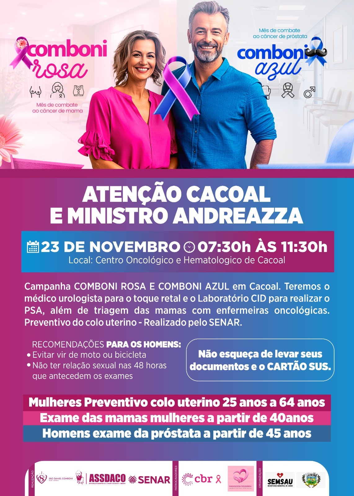 Mais uma vez a Associação Assistencial à Saúde São Daniel Comboni (ASSDACO) realiza uma grande campanha de prevenção ao câncer, desta vez em Cacoal. No dia 23 de novembro, entre às 7h30 e 11h30, as campanhas Comboni Rosa e Comboni Azul, para mulheres e homens, acontece no Centro Oncológico e Hematológico de Cacoal.