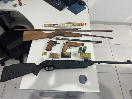 Entre os materiais apreendidos estavam dezenas de cartuchos calibre .22, uma garrucha de fabricação caseira, uma espingarda de pressão, barras metálicas possivelmente utilizadas para confecção de canos de armas, além de pólvora, espoletas, chumbadas e eletrodos utilizados em soldagem.