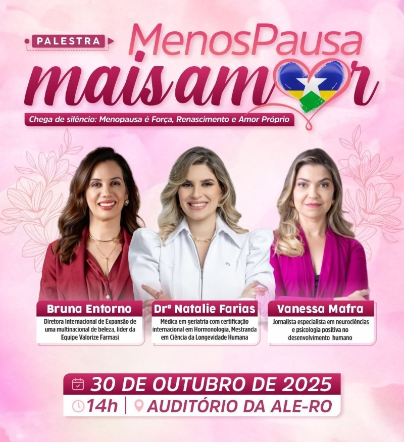 Em alusão ao Outubro Rosa, a Assembleia Legislativa de Rondônia (Alero) sediará, no dia 30 de outubro, a palestra “MenosPausa MaisAmor – Chega de silêncio: Menopausa é força, renascimento e amor próprio”. O evento é uma iniciativa do deputado estadual Marcelo Cruz em parceria com o vereador Pastor Evanildo e tem como propósito fortalecer as ações de conscientização sobre a saúde da mulher, com foco no câncer de mama, na menopausa e na reposição hormonal.