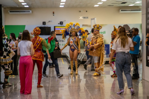 Passageiros que desembarcaram na tarde de segunda-feira (5) no Aeroporto Internacional Governador Jorge Teixeira de Oliveira foram recepcionados em clima de carnaval, com direito a marchinhas e à presença da Corte do Rei Momo como parte do trabalho de divulgação do “Circuito Manelão”, elaborado pela Secretaria Municipal de Indústria, Comércio, Turismo e Trabalho (Semdestur).