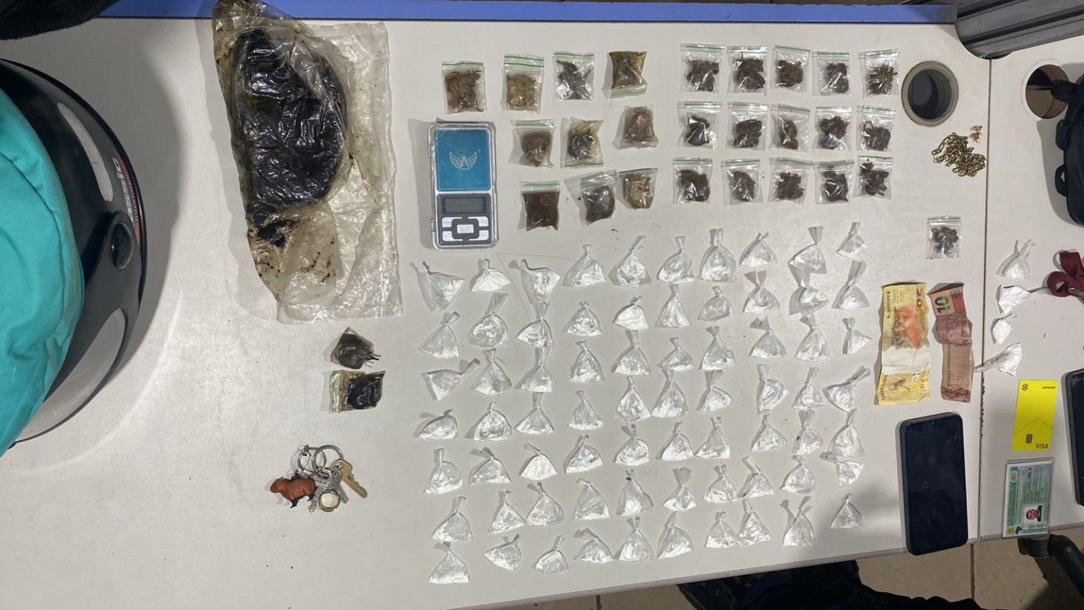 Durante buscas nas proximidades e em um apartamento ligado aos suspeitos, os policiais encontraram 80 porções aparentando ser cocaína, 15 porções de maconha, porções de haxixe e uma balança de precisão.