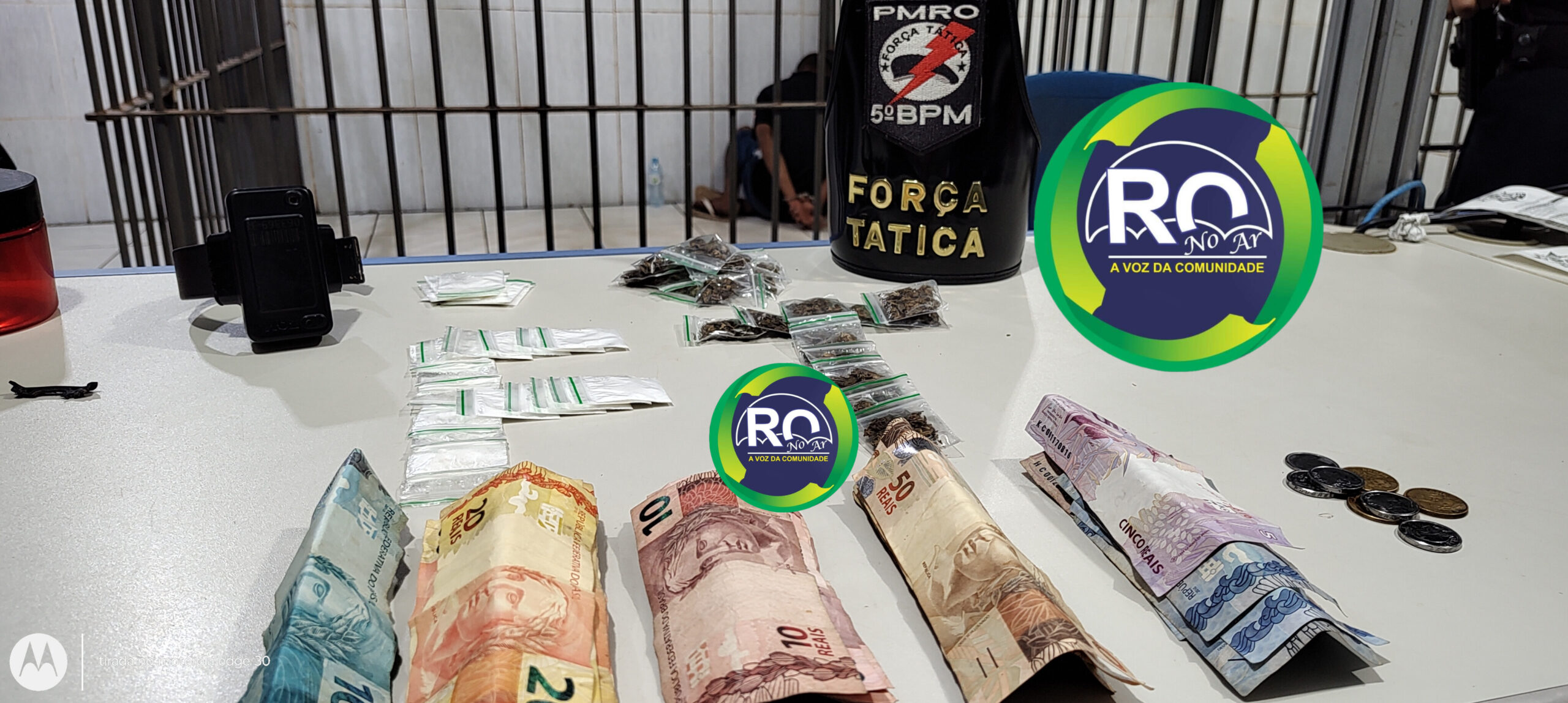 A Força Tática em abordagem a um homem no condomínio orgulho do madeira, o conduzido estava com uma bolsa feminina, sendo que dentro da bolsa tinha várias porções de cocaína, Skank, dinheiro e a sua tornozeleira que estava rompida guardada, com isso poderia se deslocar para qualquer local.