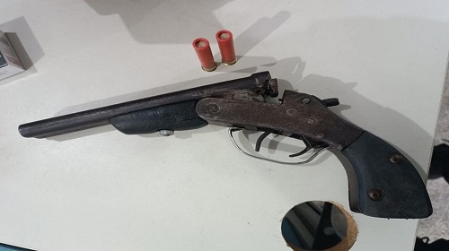 A dupla foi interceptada e realizada revista pessoal, e neste momento nada de ilícito encontrado. Porém, ao retornar o percurso percorrido e realizada a varredura onde o objeto foi descartado, foi constatado que se tratava de uma arma de fogo tipo garrucha de dois canos com duas munições intactas na câmara, calibre 36, sem sinal identificador. Nenhum dos envolvidos assumiu ser proprietário do armamento.