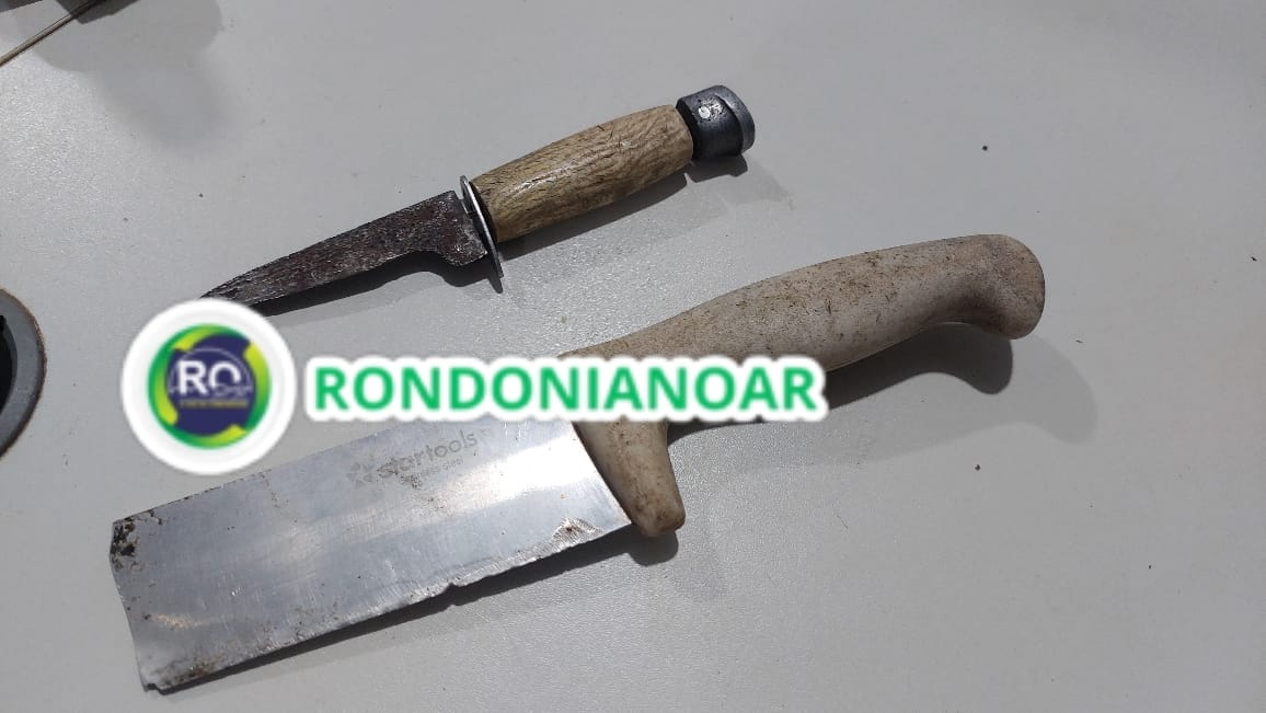 A equipe policial foi acionada e rapidamente se deslocou até o local indicado. Ao chegar, os agentes visualizaram o suspeito, que recebeu voz de abordagem. Durante a revista pessoal, foram encontradas duas armas brancas em posse do homem: um punhal e uma faca de cozinha.
