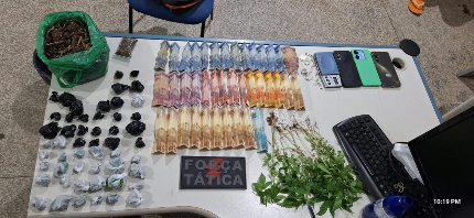 Durante a averiguação, os policiais empregaram tirocínio policial ao perceber forte odor característico de maconha, o que motivou a ampliação das buscas nas imediações. A equipe localizou uma motoneta utilizada, em tese, para a entrega de entorpecentes, onde foram encontrados cerca de 596 gramas de maconha do tipo skank, parte já fracionada em 53 porções prontas para comercialização, além de balança de precisão e dinheiro em espécie, material compatível com o tráfico ilícito de drogas.