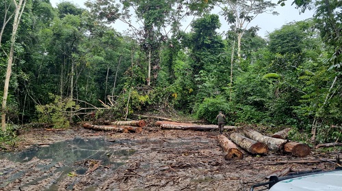 Ao adentrar na área, encontraram uma clareira com cerca de 20 toras de madeira de diversas espécies. Uma inspeção minuciosa revelou que não havia placas de identificação ou qualquer indício de que o local fosse uma área de manejo florestal legalmente autorizada. Isso sugeria que as árvores foram derrubadas ilegalmente e armazenadas ali de maneira irregular, configurando um flagrante delito ambiental.