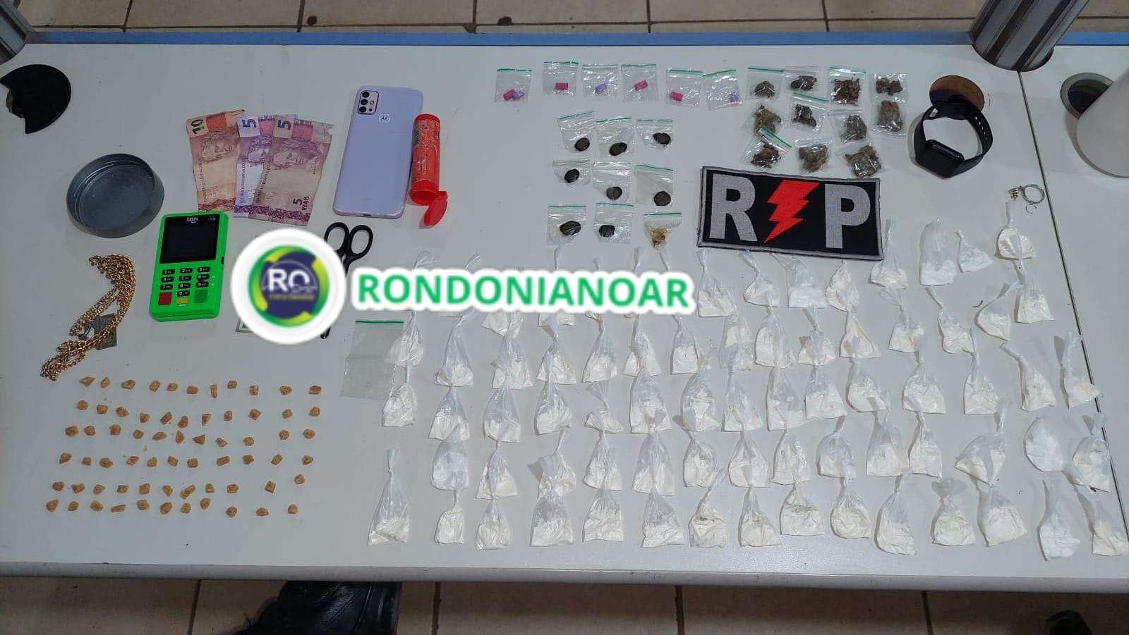 O suspeito,  fugiu pelos fundos para uma área de mata, mas foi capturado após acompanhamento tático.Buscas na residência revelaram os itens ilícitos sobre uma mesa: 74 invólucros de substância análoga à cocaína, 66 de crack, 9 de haxixe, 6 de LSD, 11 de maconha, além de resquícios em potes, tesoura para fracionamento, R$ 20 em espécie, máquina de cartão TON (usada para vendas via PIX), corrente dourada, relógio, celular Motorola.