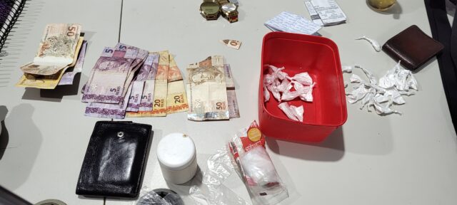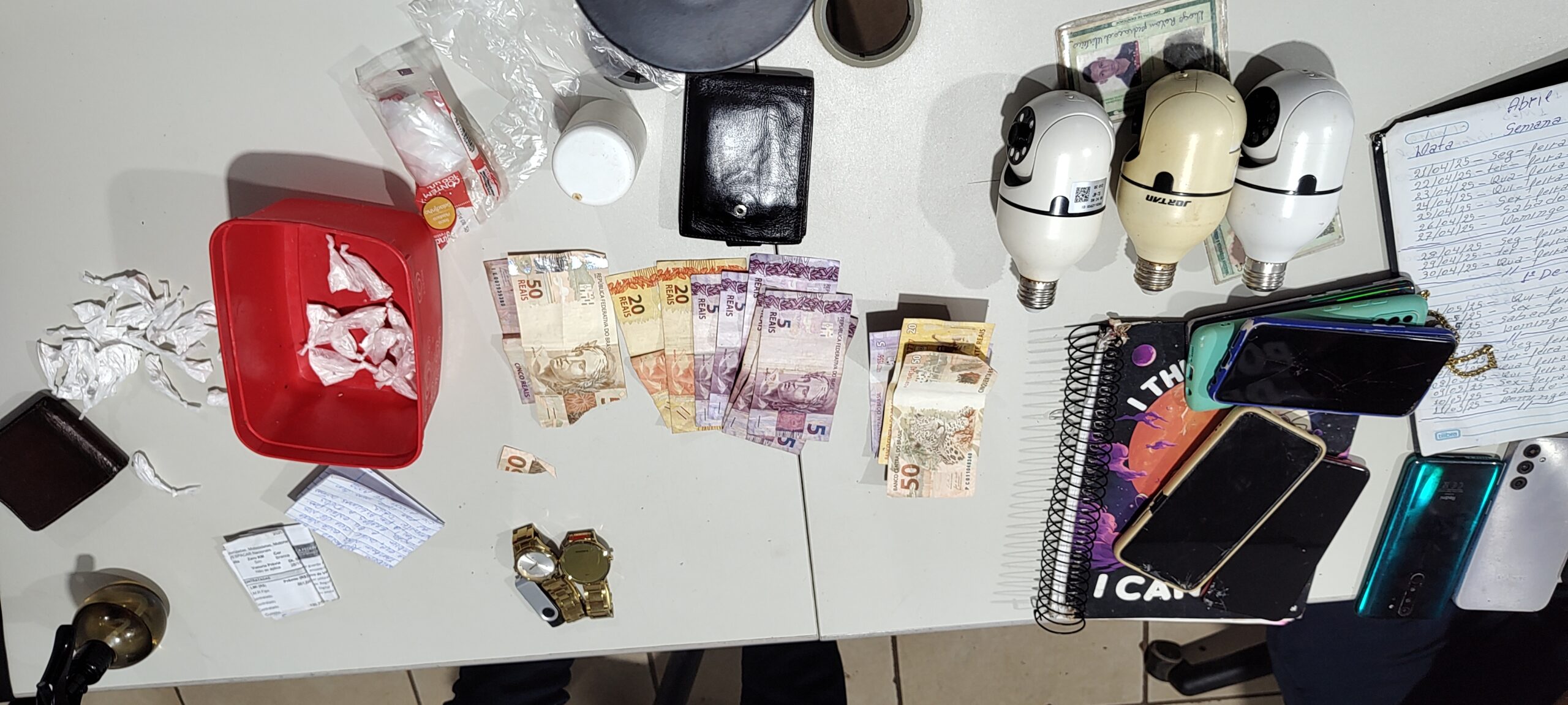 No local, a equipe localizou diversas porções de cocaína, câmeras de monitoramento usadas para vigilância, caderno com anotações do tráfico, uma TV de 75 polegadas de procedência duvidosa e uma moto apreendida. Todos foram encaminhados ao Departamento de Flagrantes para procedimentos cabíveis.