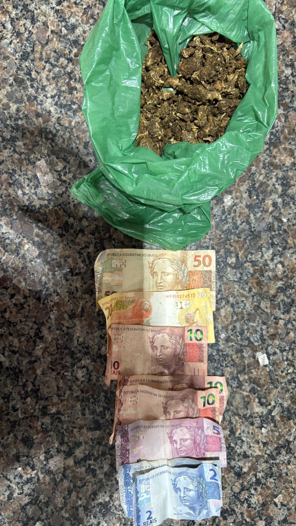 Em continuidade à ação, foi realizada busca pessoal, sendo localizada uma quantia em dinheiro em espécie. A substância apreendida, após pesagem realizada na unidade policial, totalizou aproximadamente 100 gramas.