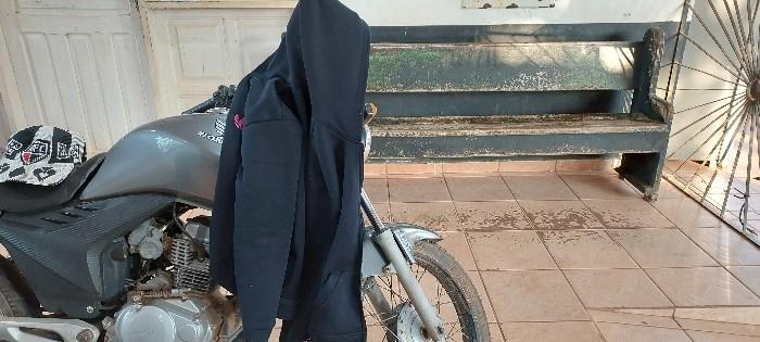 A motocicleta furtada foi localizada e no local foram encontrados uma capa de capuz preta e um boné de crochê preto e branco, possivelmente deixados pelo infrator.
