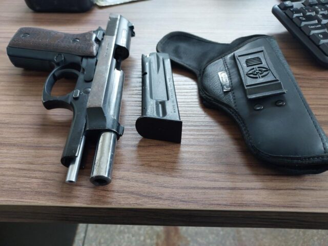 No endereço informado, uma residência na rua 916, os policiais fizeram uma averiguação onde localizaram uma pistola Taurus, modelo PT-765 e um carregador denunciado.
