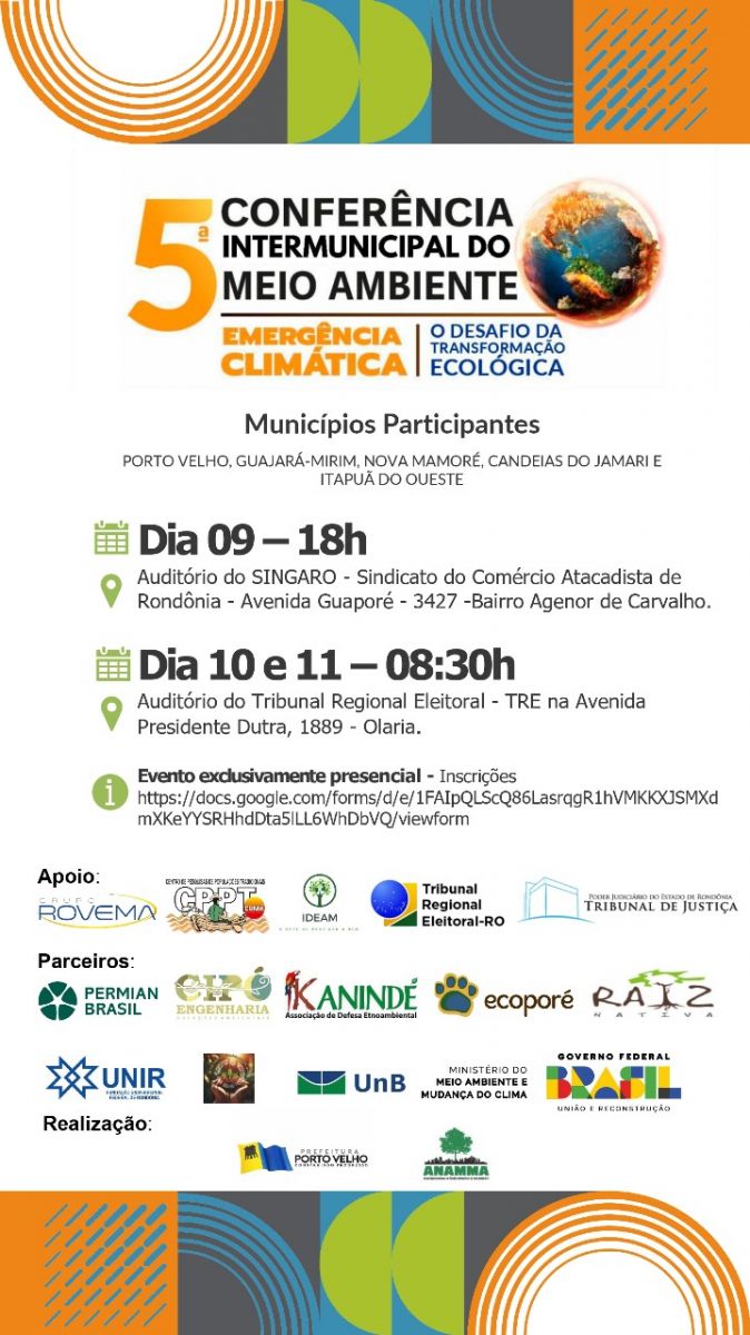 A Conferência vai reunir, além de Porto Velho, os municípios de Itapuã do Oeste, Candeias do Jamari, Nova Mamoré e Guajará-Mirim. O tema central é “Clima Emergência: O Desafio da Transformação Ecológica”. Serão cinco eixos temáticos: Mitigação, Adaptação e Preparação para Desastres, Transformação Ecológica, Justiça Climática e Governança e Educação Ambiental.