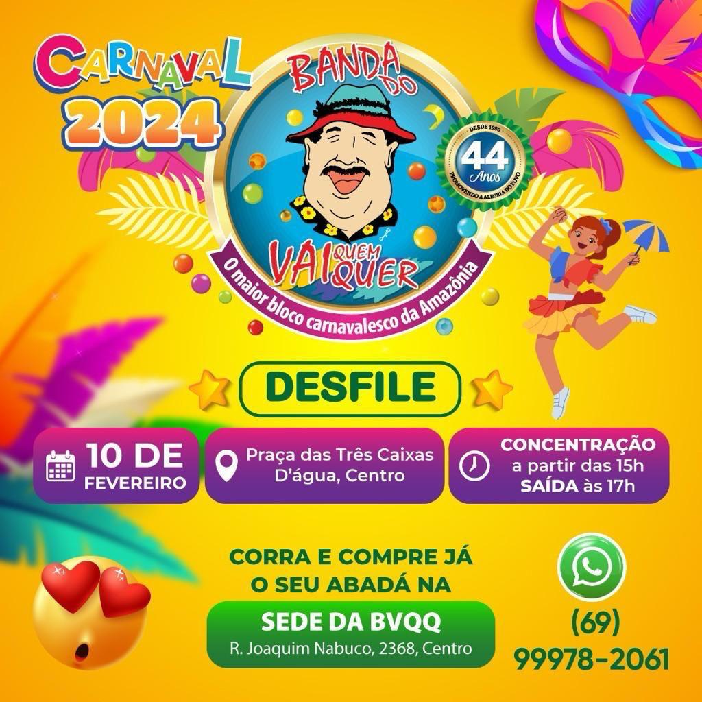O desfile da Banda do Vai Quem Quer já é no próximo sábado, 10 de fevereiro, com concentração ás 15h, na Praça das Três Caixas D’água, saída ás 17h e termino ás 22h. Faltando poucos dias para a saída do maior bloco de Carnaval de rua de Porto Velho, a movimentação da sede do bloco (av. Joaquim Nabuco 2368), está intensa a procura de abadá, que está custando R$100,00.