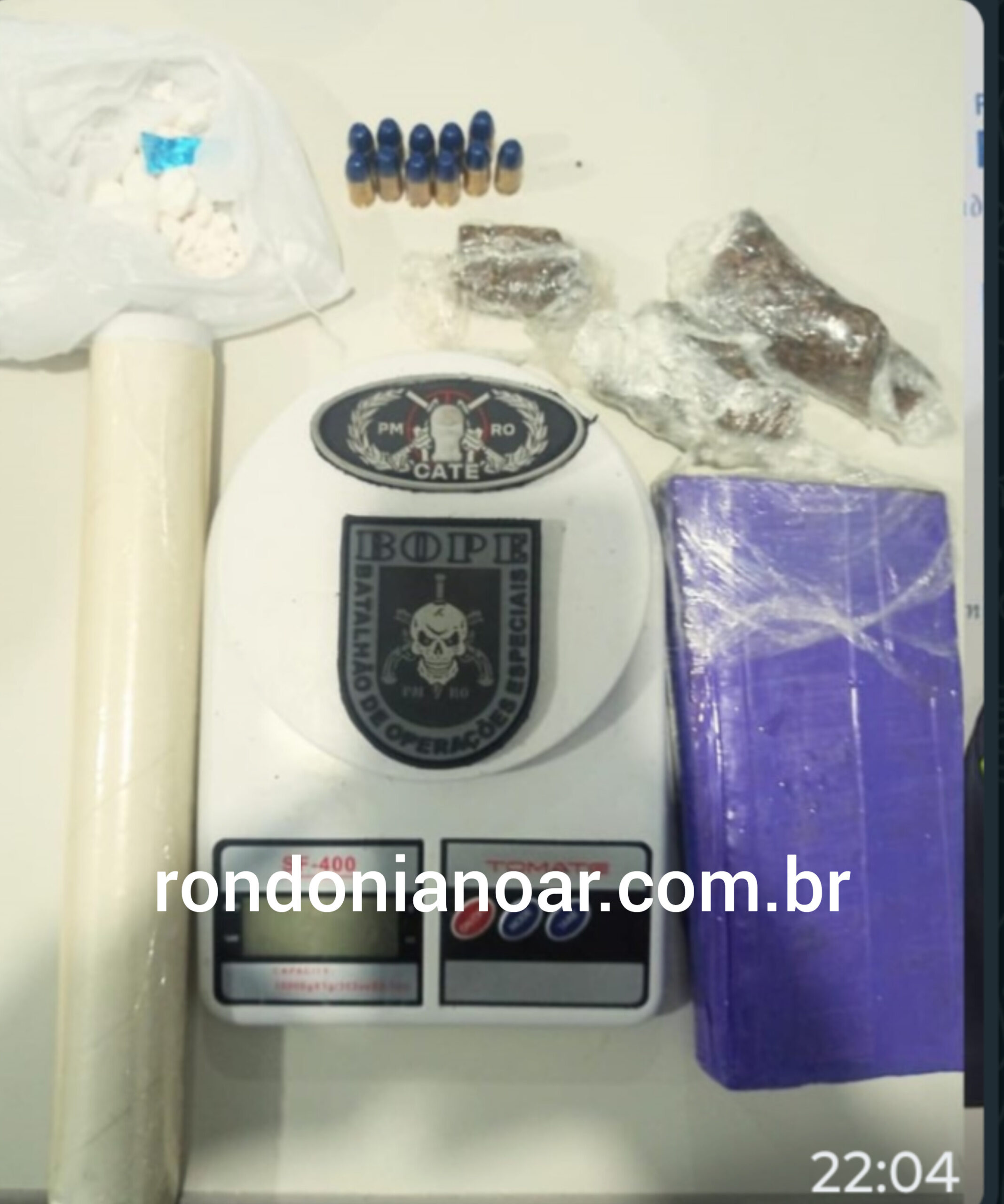 Foram apreendidos quatro invólucros de maconha, um invólucro de cocaína, (50g), um “tijolo” de 500g de maconha, 11 munições de 9mm, uma balança de precisão, um rolo de papel filme. Nesta ocorrência foi presa uma das lideranças de uma facção criminosa em nível nacional. Ele atuava em Rondônia.